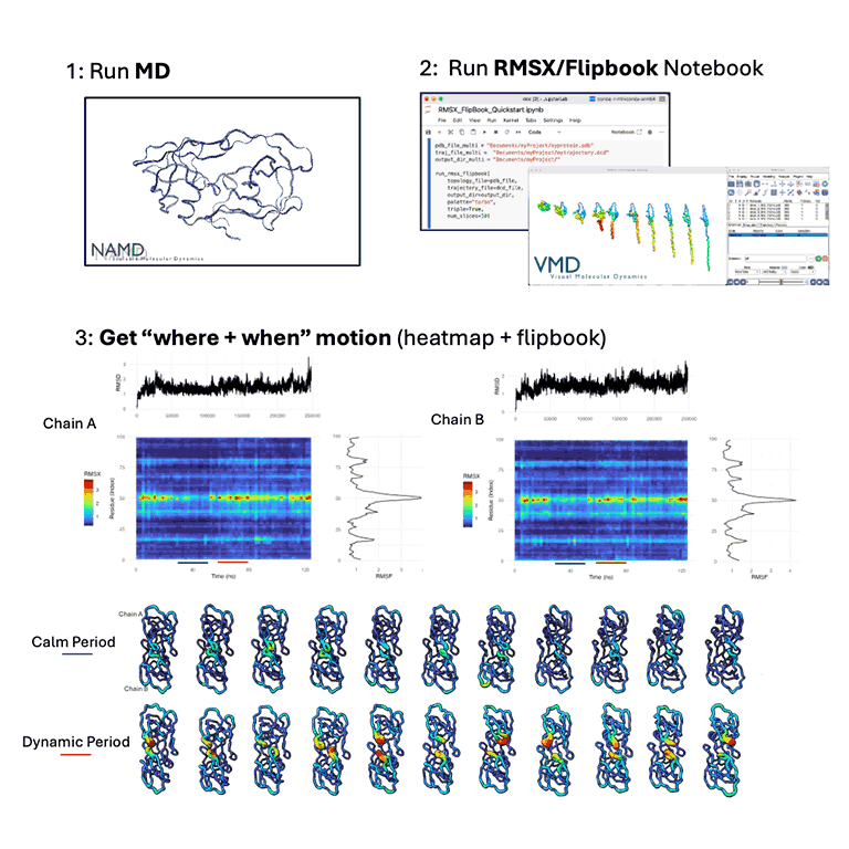 Together, RMSX and Flipbook provide a streamlined pipeline for high-resolution analysis and visualization of biomolecular dynamics. The tools are designed to be open source and freely available, compatible with standard molecular dynamics workflows, and easy to integrate into Jupyter notebooks, Google Colabs and visualization platforms. By helping researchers identify when and where proteins move, this work supports studies in structural biology, drug discovery, enzymology, mechanistic biochemistry and more.